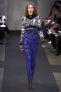 Lazaro Hernandez and Jack McCoulough are definitely fashion's cool kids. Their fall show had the social-set in attendance plus trend setting heavy hitter Mary-Kate Olsen front row. The eighties seemed to be in high gear as they showed high waisted printed skinny jeans (made in collaboration with the denim label J Brand). Models carried the new and probably soon to be must have P.S. 11 Bag, all the while strutting on wooden-platform stacked heel shoes. The collection showed some great cashmere coats, varsity jackets, and cheerleader skirts plus thigh high stockings that gave off a sort of addams family prep school look. They showed blurred and distorted plaids on amazing coupe faille dresses while the models had a dark and eerie vibe to their beauty look. So here are some of my favorite looks!!!